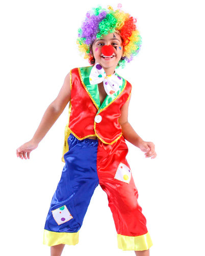 Fantasia toda em cetim, fraque, calça e gravata bem coloridos. Aumente ainda mais a brincadeira com a peruca e nariz de palhaço... Impossível não ficar feliz !!!!