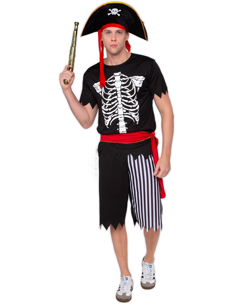 Conjunto de bermudão preto e camiseta vermelha com silk de caveira dourada, a faixa na cintura. Mas se você quer um visual invejável, aposte num chapéu de pirata de veludo e numa espada .. e sua aventura vai começar!