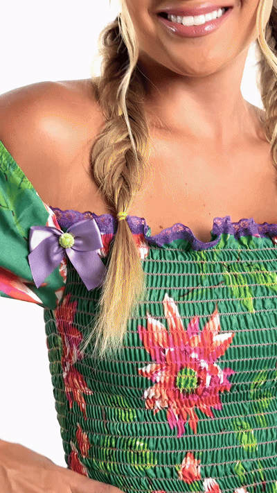 MANGAS BUFANTES COM RENDA COLORIDA. SAIA RODADA COM BABADOS CONTRASTANTES E FITA DE CETIM. ACOMPANHA CALÇOLA (SHORTS).