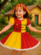 O vestido possui modelagem rodada em cores vibrantes de vermelho e amarelo, com detalhes de botões e apliques que remetem ao figurino clássico da personagem. As mangas bufantes e o acabamento delicado em renda deixam a peça ainda mais charmosa.